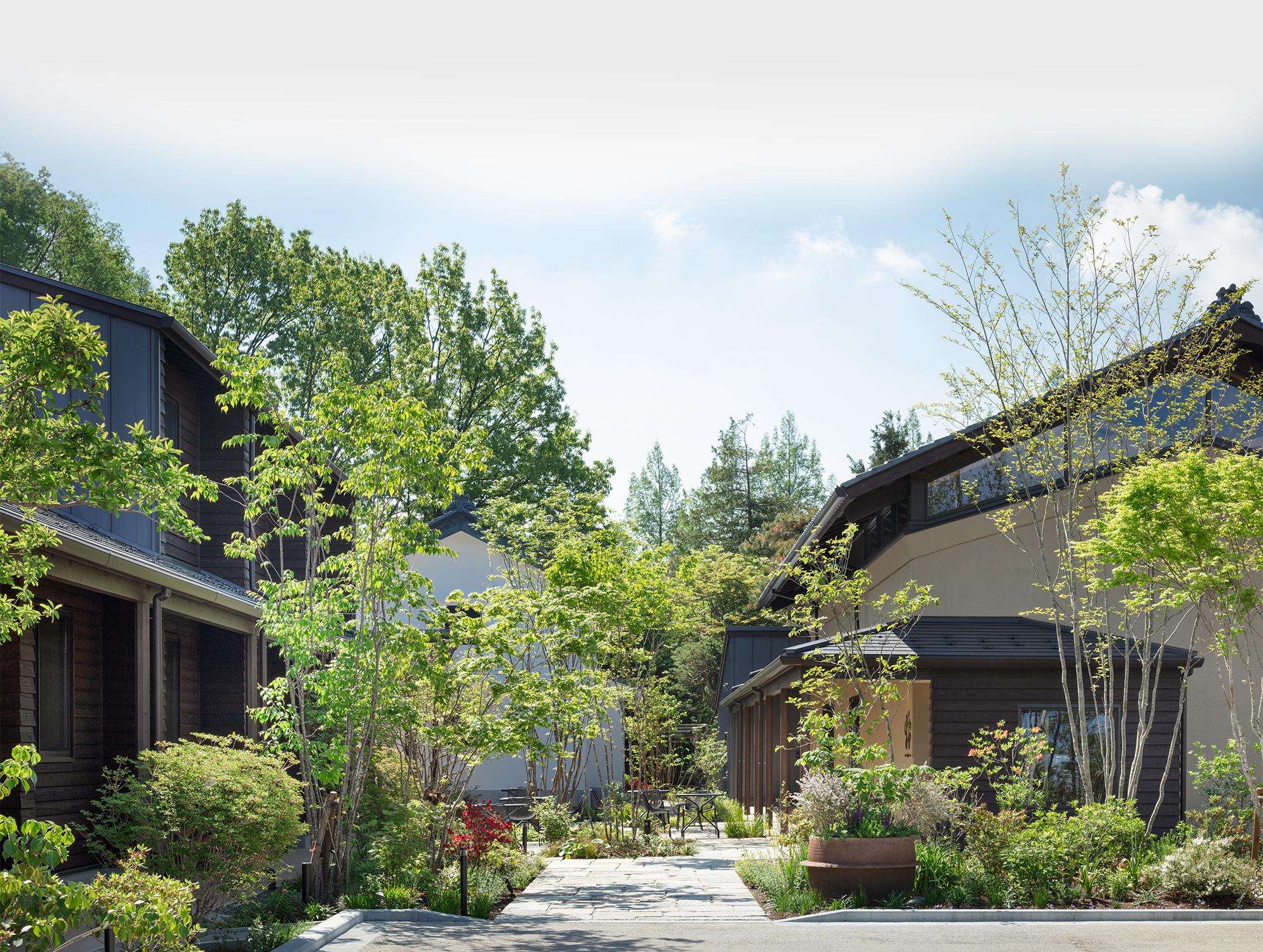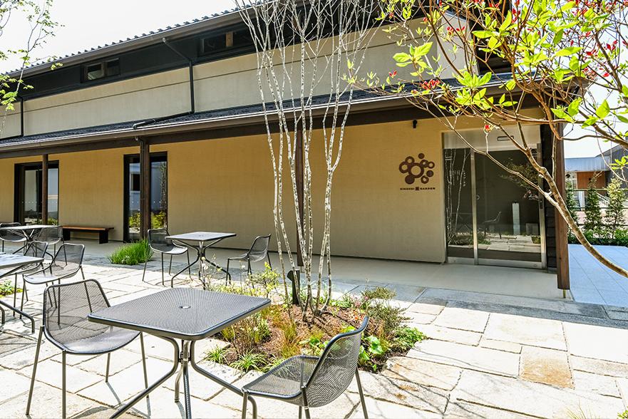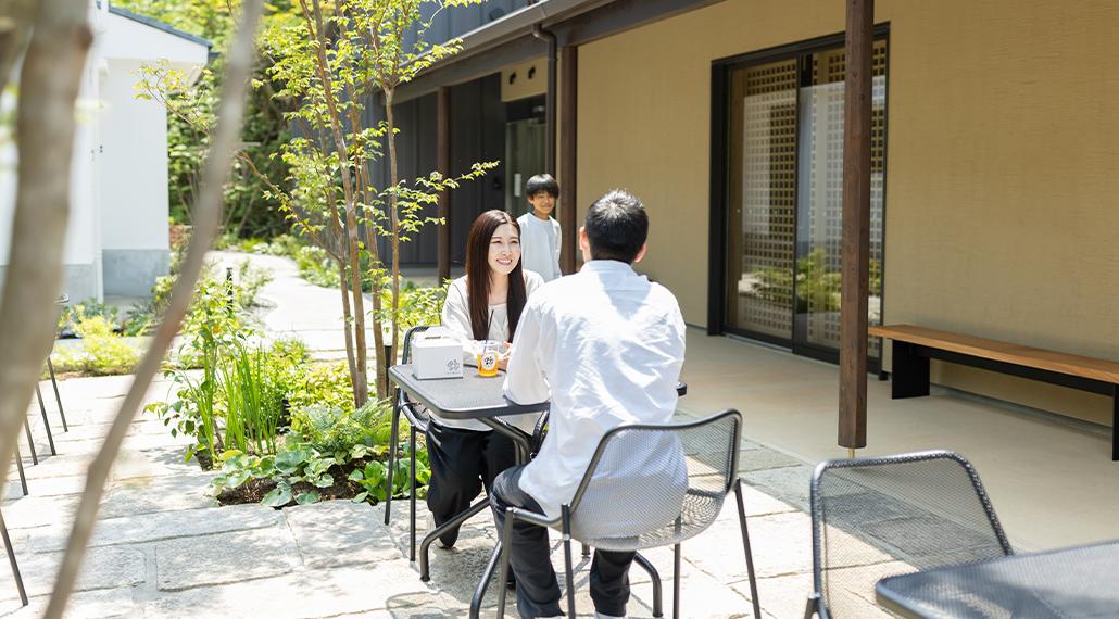 緑に囲まれた心地よい屋外空間。のんびり過ごす場所でもあり、キッチンカーを呼んだりマルシェをひらいたり。みんながたのしめる、にぎわいの場にもなります。